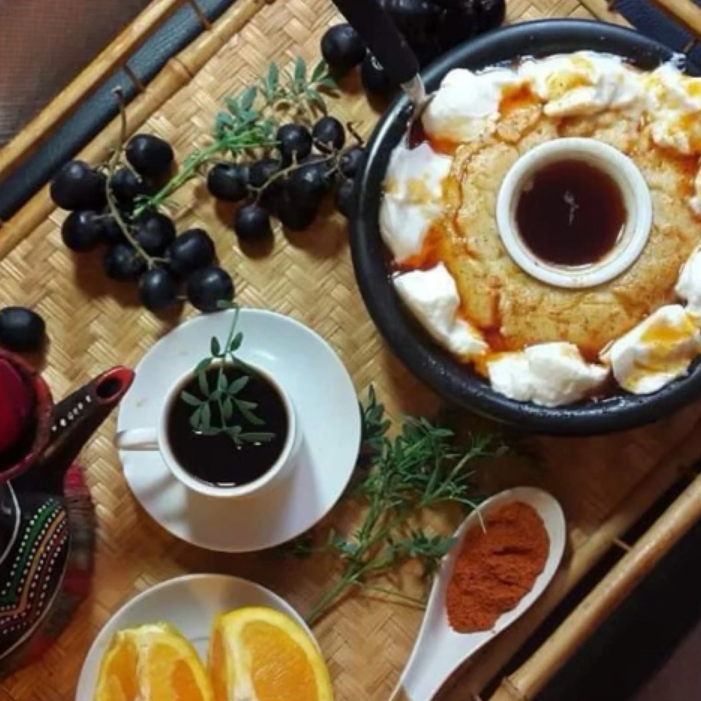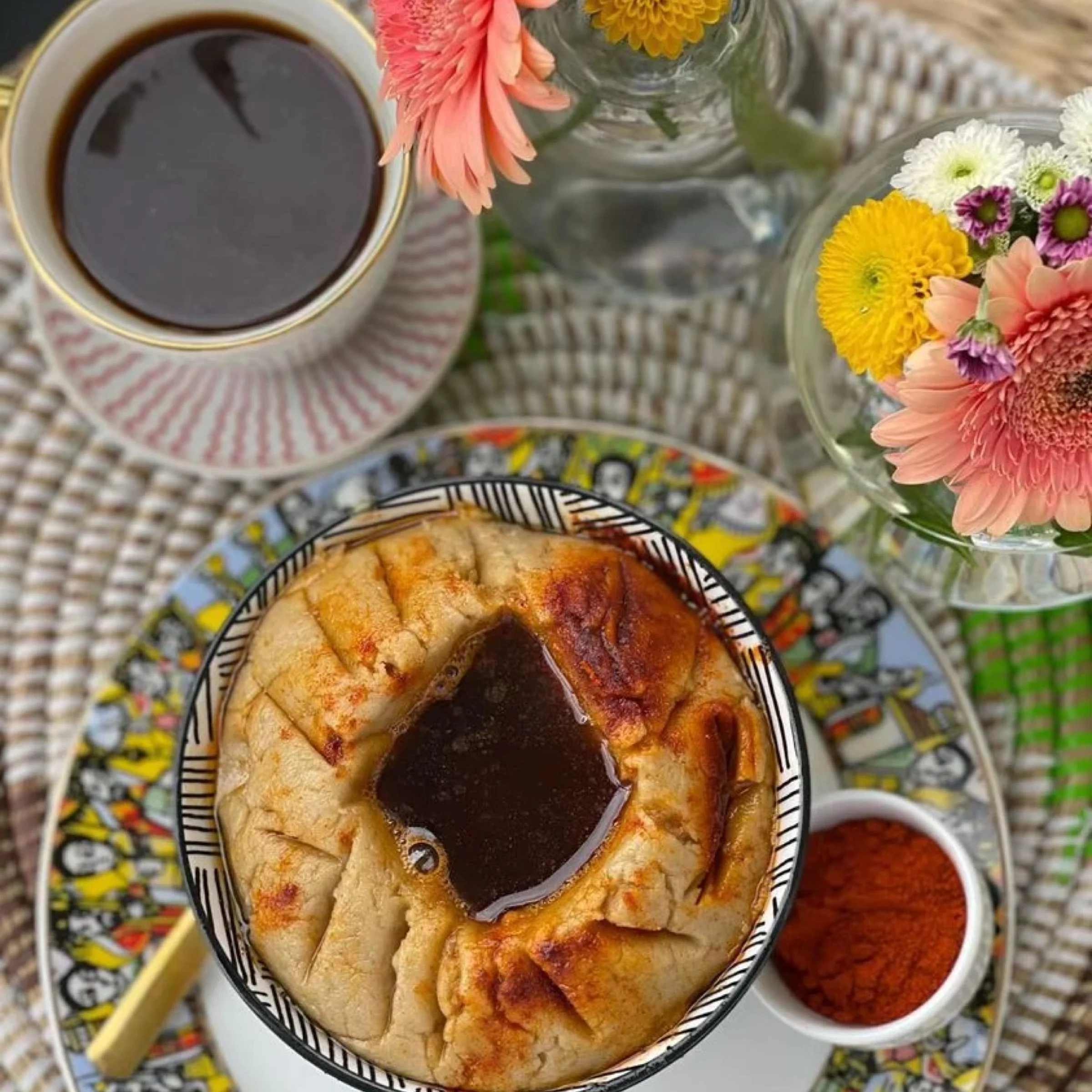 Once the genfo has taken shape, get a spoon, and dip it in a cup of kibbe and make a deep impression in the genfo. Make sure not to make a whole in the bottom of it. Once you have your impression. Melt the kibbe and pour it into the impression. Take a tablespoon of berbere and put it in the impression and stir. Along the out side of the genfo put your yogurt or sour cream to your liking.