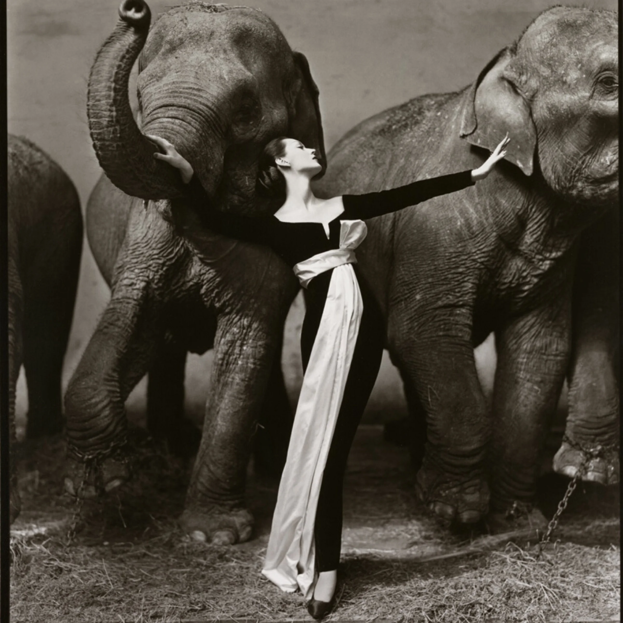 Dovima is so elegant in an Yves Saint Laurent dress from the House of Dior. Her poise is graceful, poised and confident. She’s also serene next to creatures that could trample her. Elephants are beautiful and one of my favorite animals. This Richard Avedon picture to me is the best creation that